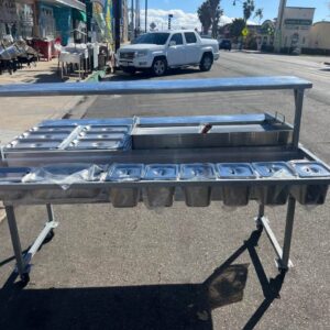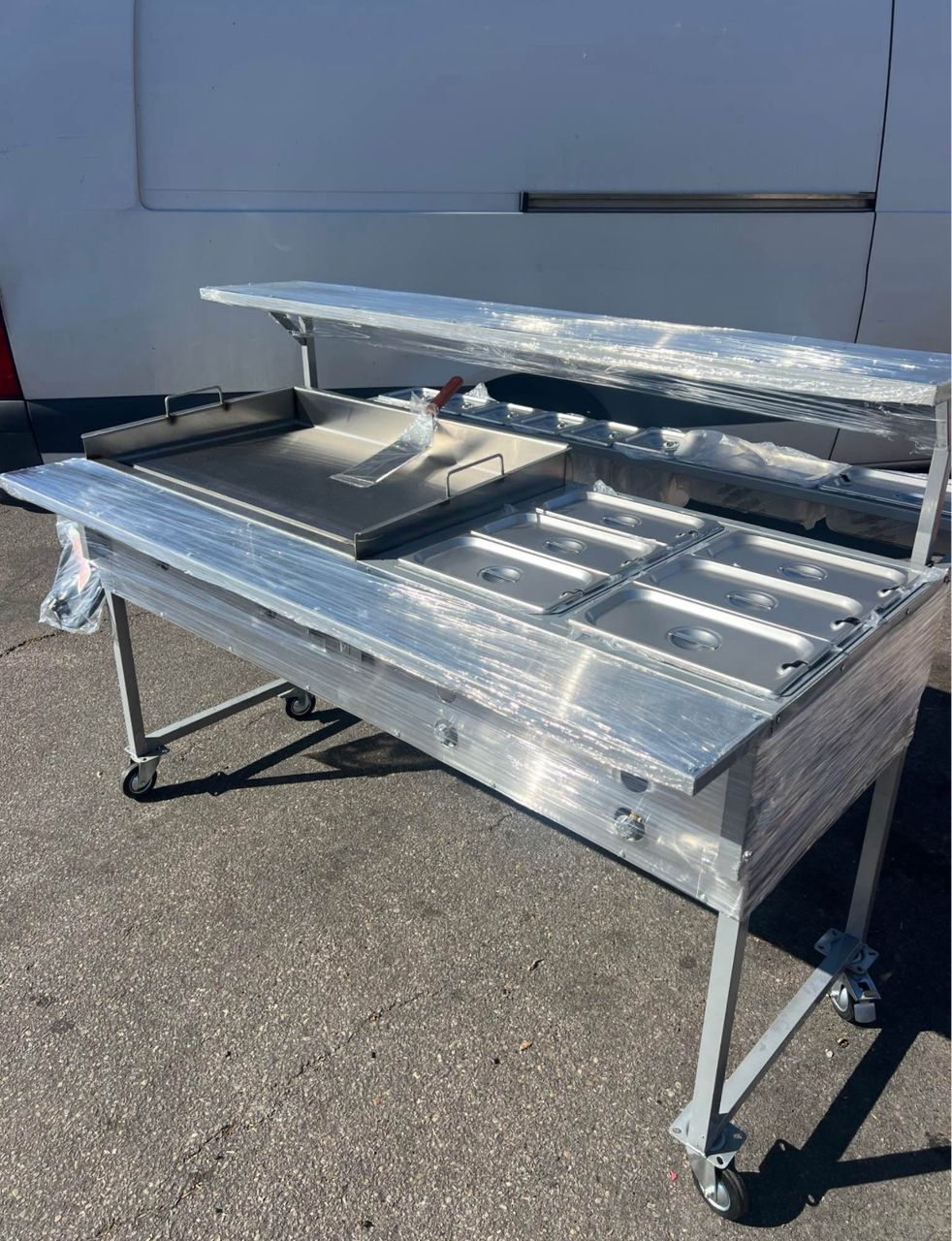 20 x 36 griddle, 6 trays and table on top, and saucepan and table in front